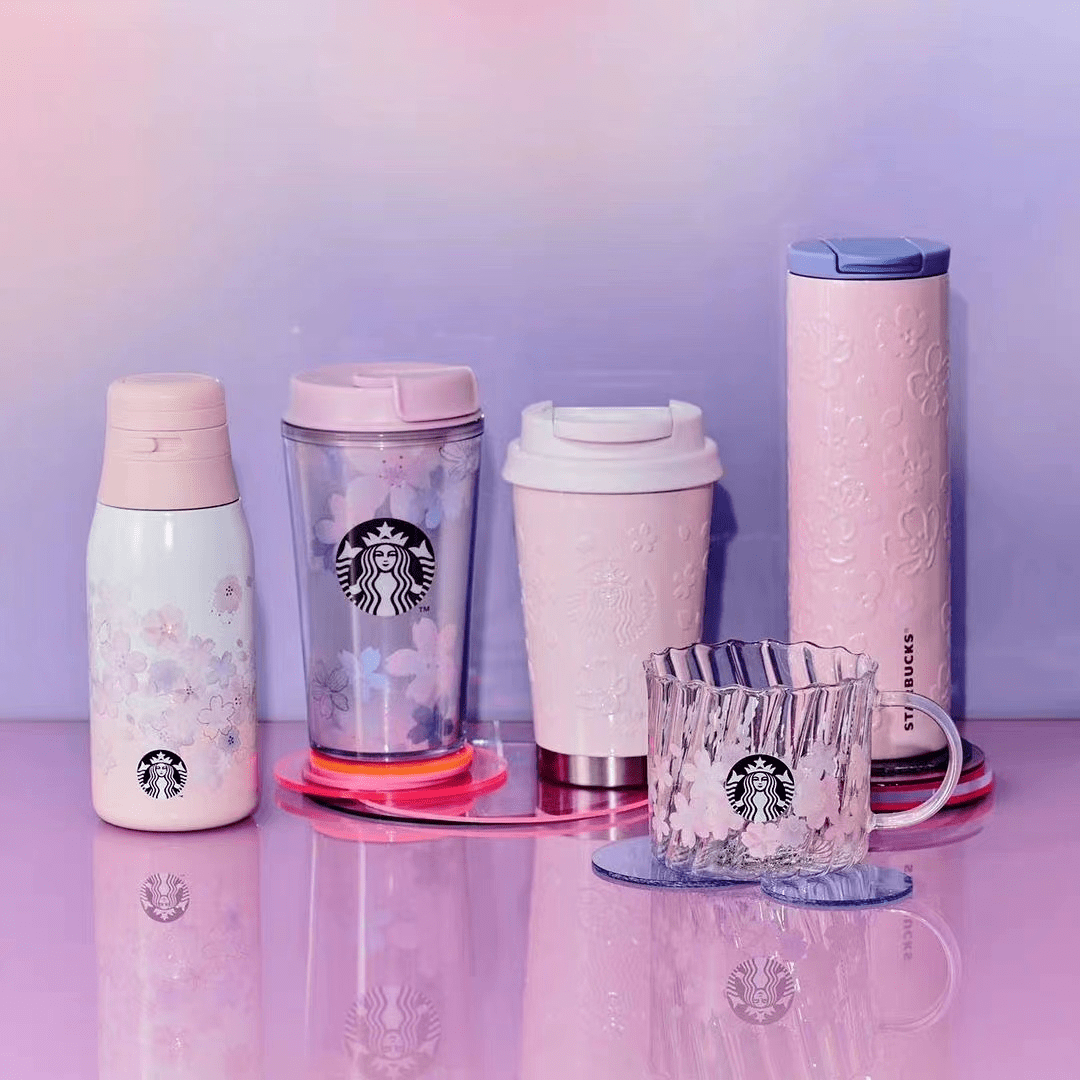 同时,樱花杯第一弹以「The SAKURA Beauty shining in the light」为主题,粉紫结合,搭配闪烁渐层光晕、细闪、樱花等元素,让保温杯、玻璃杯等日常用具,洋溢着春天的活力!
