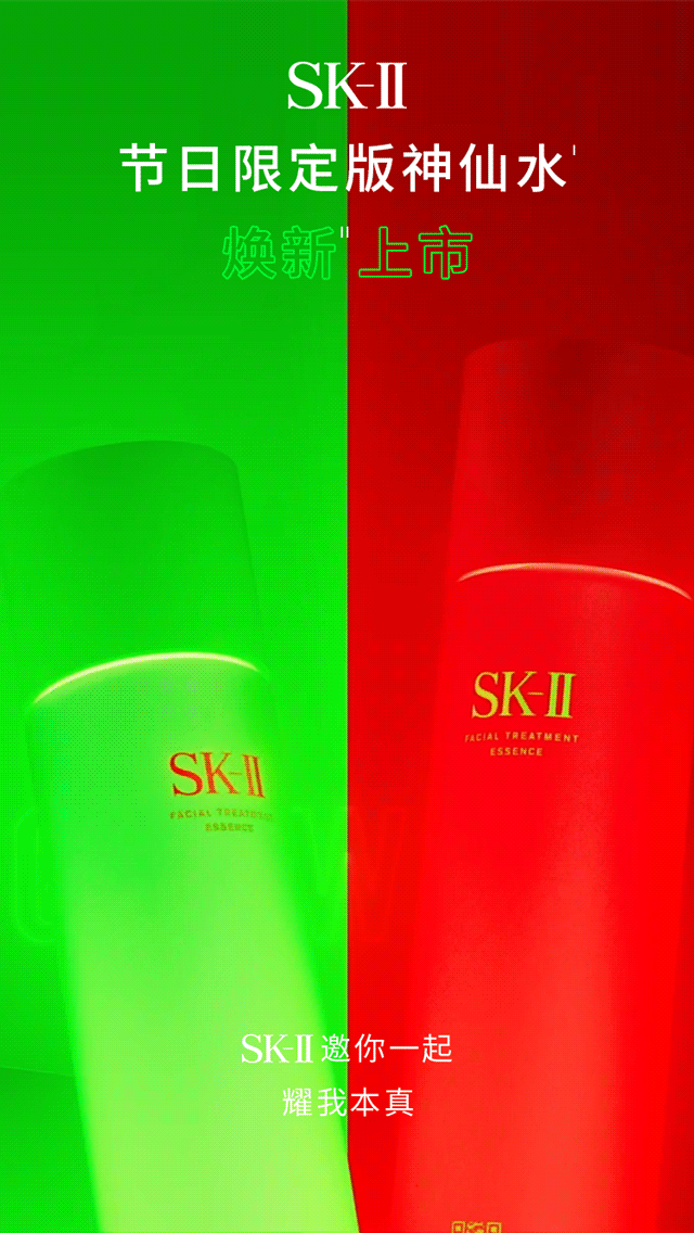 SK-II这次推出的节日限定版神仙水,在视觉设计来颠覆之前简洁的设计风格,大胆采用了亮眼的红配绿。